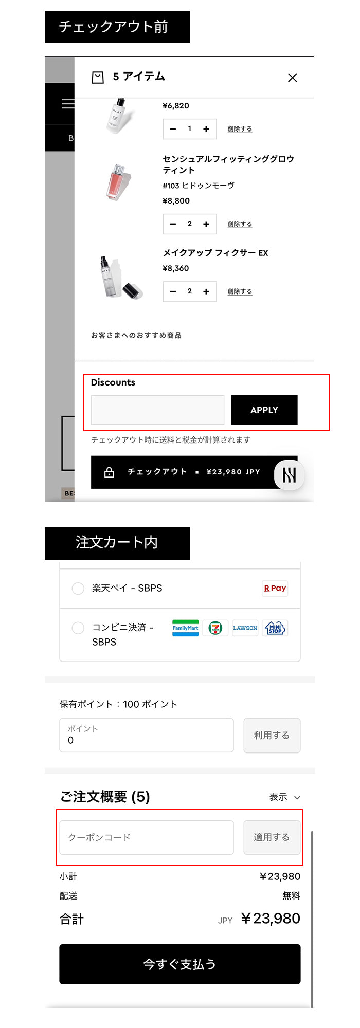 チェックアウト前のカート内下段もしくはチェックアウト後のショッピングカート内ページ下段でプロモーションコードを登録すると、キャンペーンが適用されます。